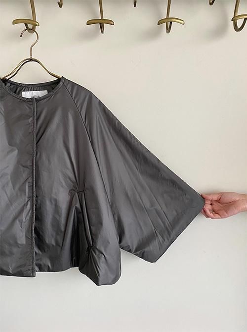 軽やかで肌触りのよいパウダータッチのポリエステルタフタを使用したポンチョタイプのハーフコート。