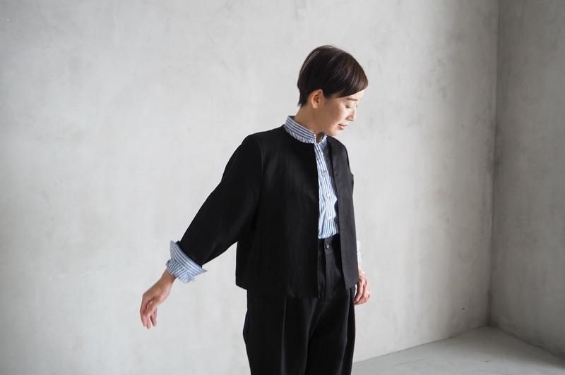 春から夏、秋まで長く活躍するノーカラーのジャケット。