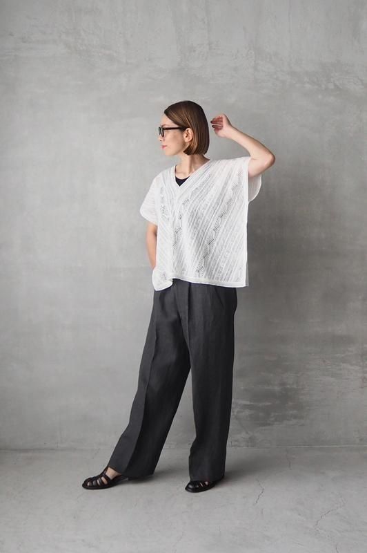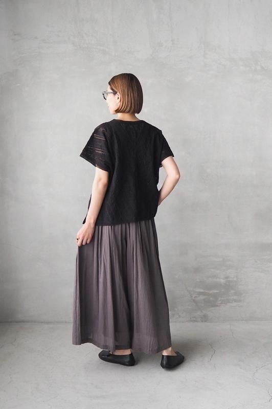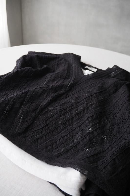 さっと被るだけでコーディネートが完成するポンチョタイプのブラウスは、レースの透け感とバイアス仕立てで印象的な雰囲気に。