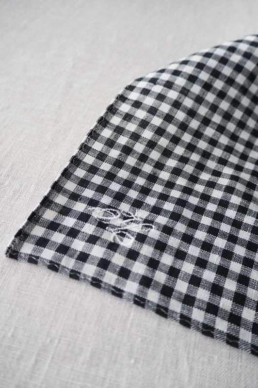 丁寧に仕上げられたハンカチの端は、ポケットチーフやスカーフに用いられる三つ折り千鳥掛けミシンという手の込んだ縫製が施されています。