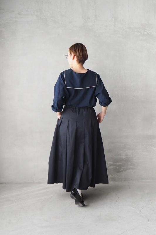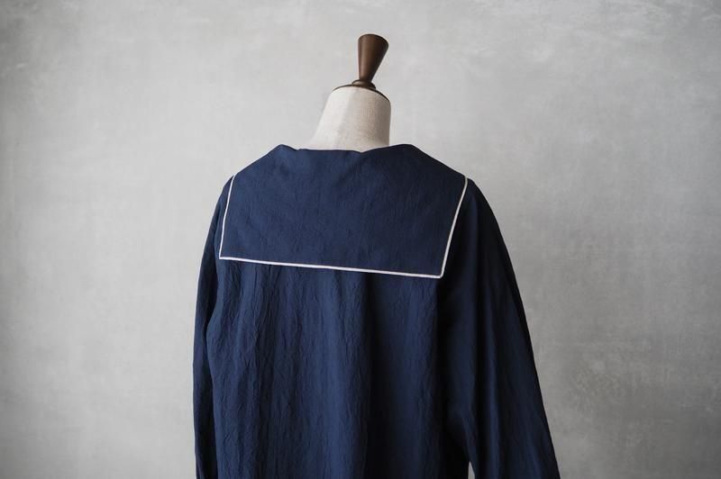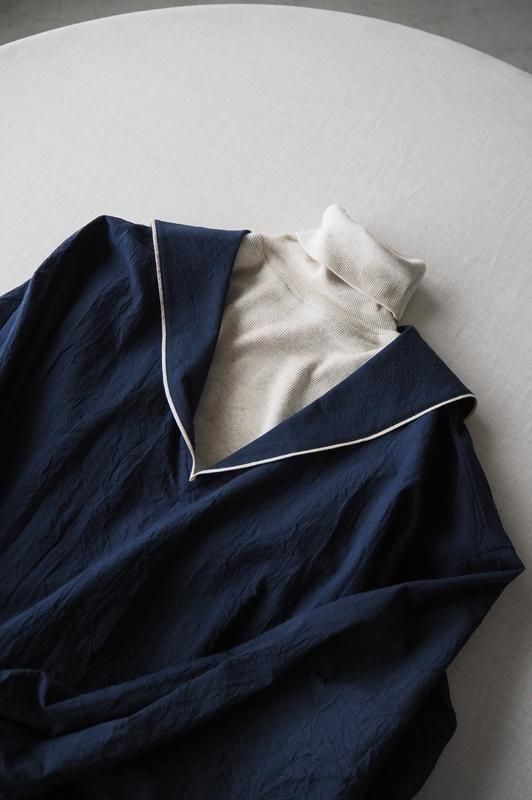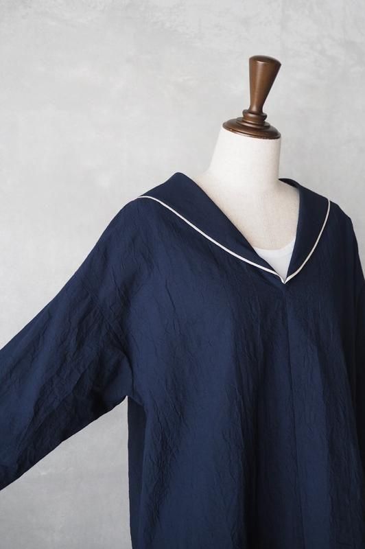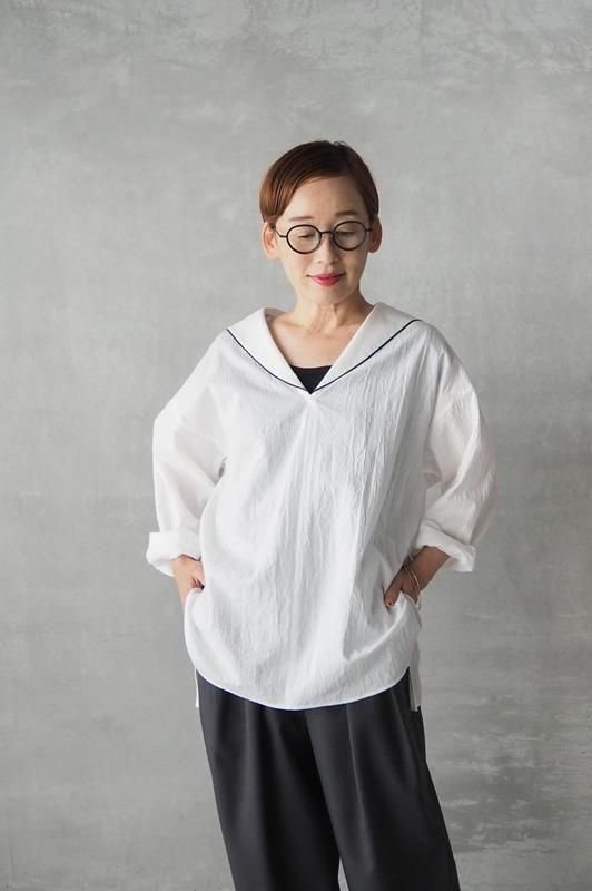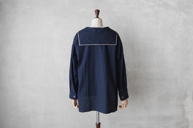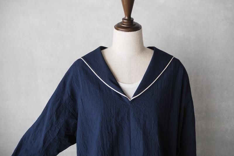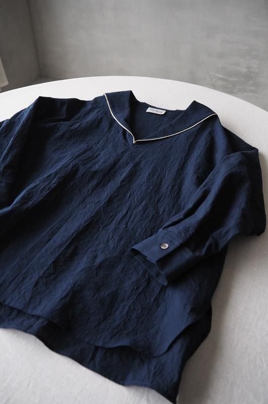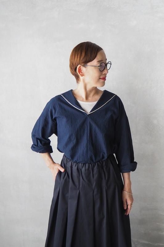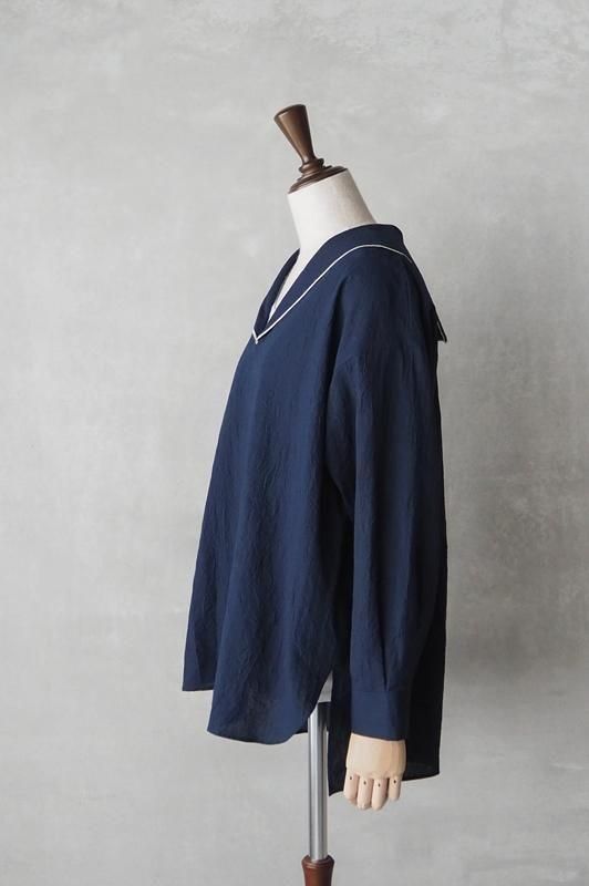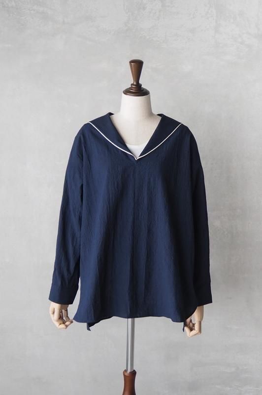 デコルテのデザインと襟のパイピングが印象的な、セーラーカラーのプルオーバーシャツです。