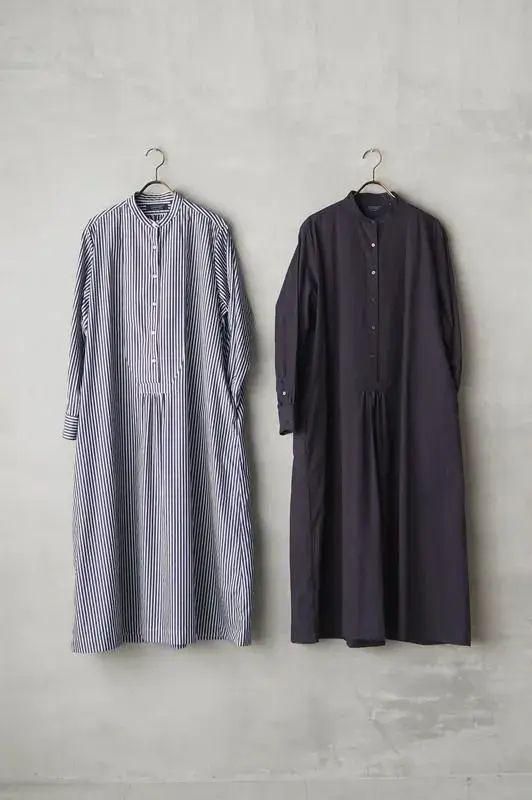 首元を美しく見せてくれるバンドカラー、体のラインを拾わないゆとりのある身幅はノーストレスな着心地ながら、すっきり見えるシルエット。