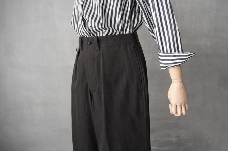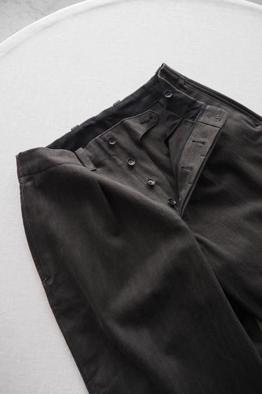 また、フランスの古いワークパンツにみられる内股の三角マチ仕様を取り入れ、足さばきのよい仕上がりに。