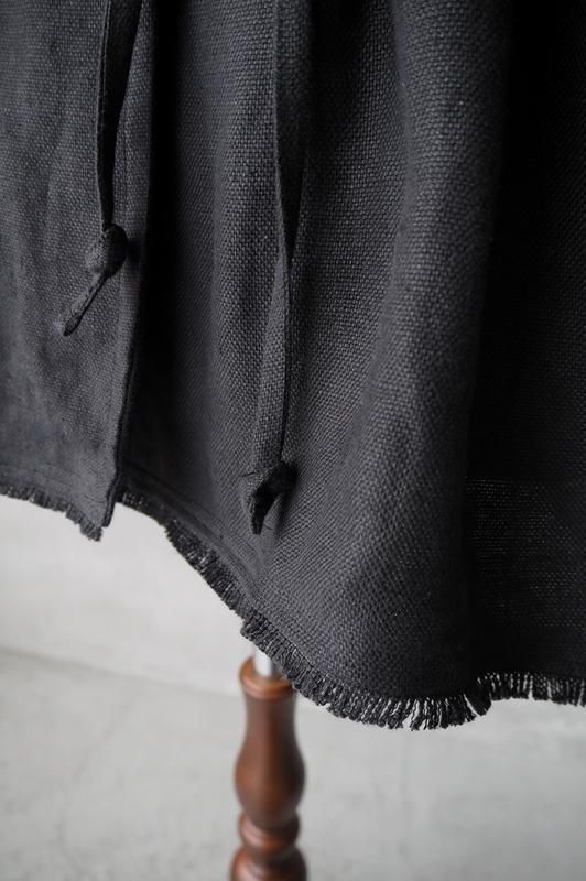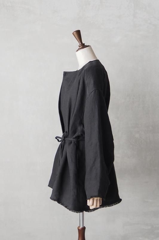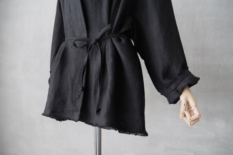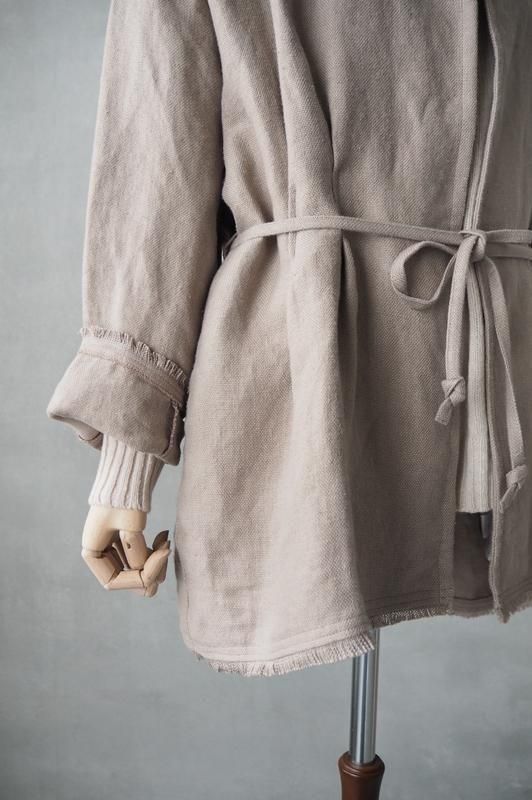 フロントはウエストリボンで留めるシンプルでミニマムなデザインで、袖口と裾のフリンジが趣を添えています。