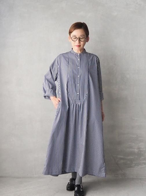 「HAND ROOM WOMENS(ハンドルームウィメンズ)」クラシックフロントワンピース(ネイビーストライプ)。